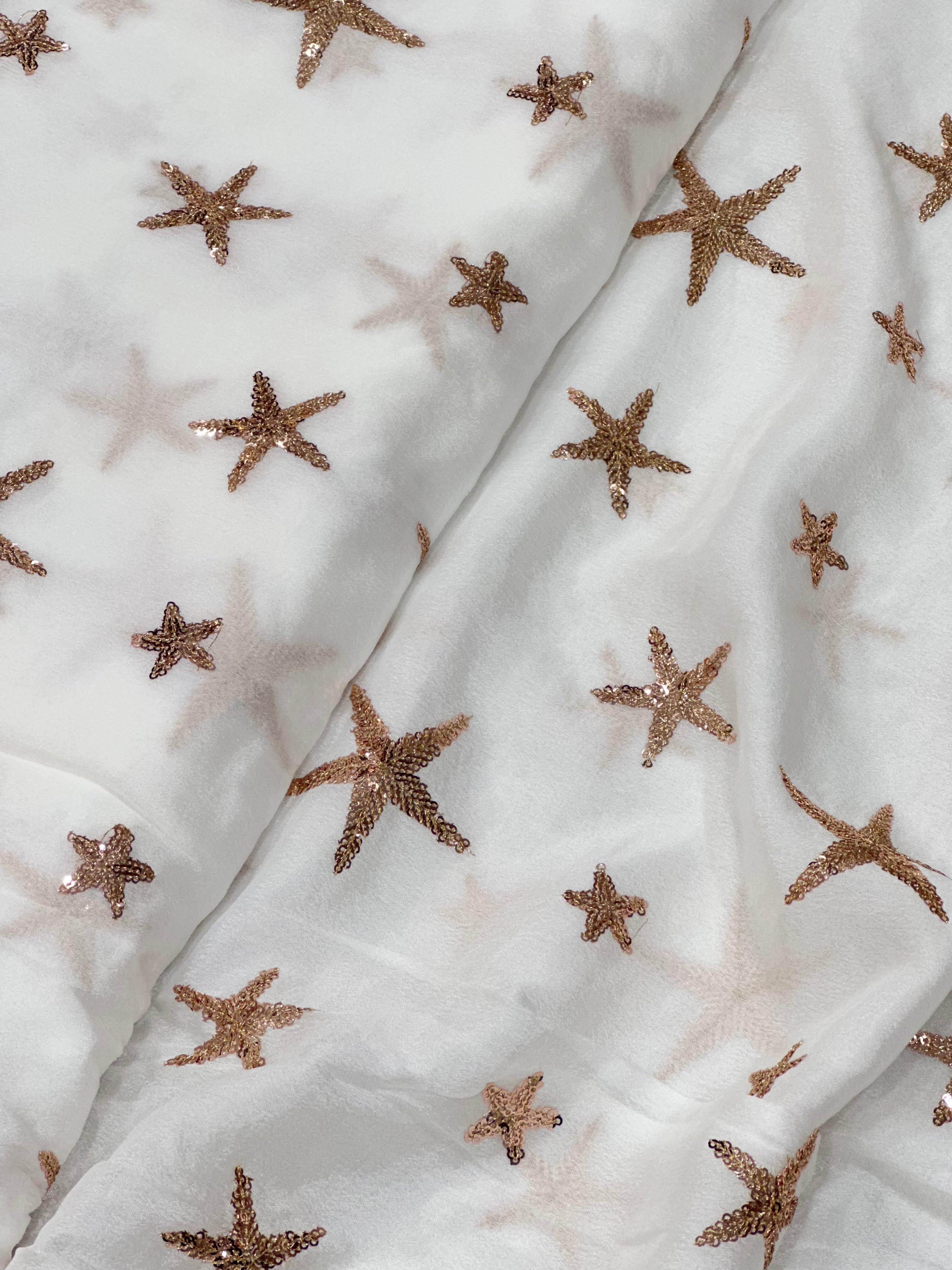 Discover the allure of a premium dyeable viscose chinon chiffon that flows effortlessly with every movement. Embellished with shimmering copper gold sequins and intricate zari star-shaped embroidery, this fabric transforms any outfit into a dazzling masterpiece. Perfect for those who want to shine with elegance and style.
