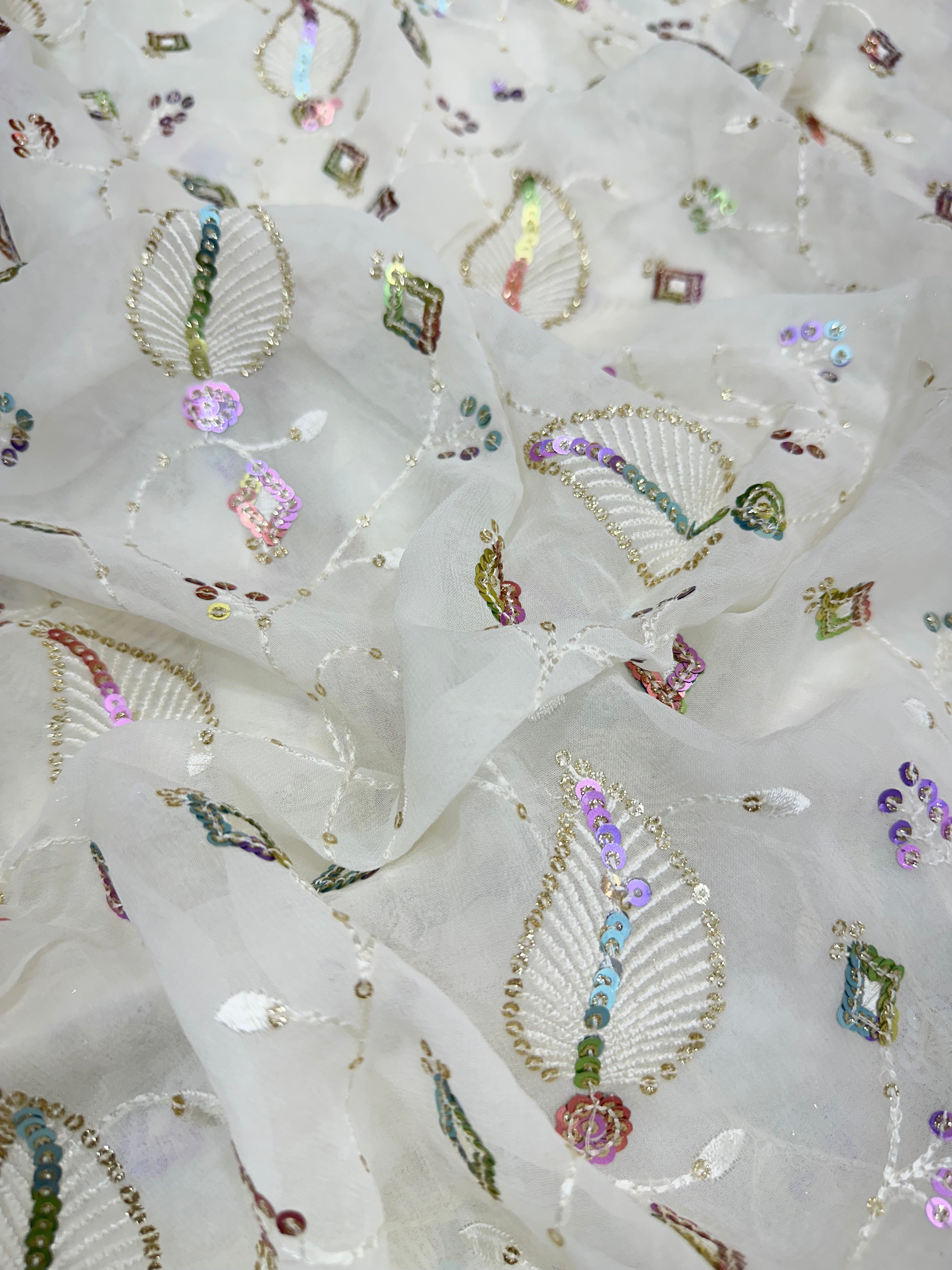 Discover Viscose Georgette, a premium dyeable pure fabric adorned with rainbow multi sequins and delicate thread leaf jaal-style embroidery. This lightweight, breathable textile combines vibrant sparkle with intricate craftsmanship, ideal for creating elegant, customizable garments that stand out.